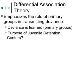 Up to 24 cash back Emphasizes the role of primary groups and secondary groups in transmitting deviance People learn the necessary techniques motives rationalizations and attitudes of deviant behaviour from people with whom they associate Thus individuals have a greater tendency to deviate from society. Differential Association theory emphasizes the role of _____ transmitting deviance. Emphasizes the role of primary groups in transmitting deviance.